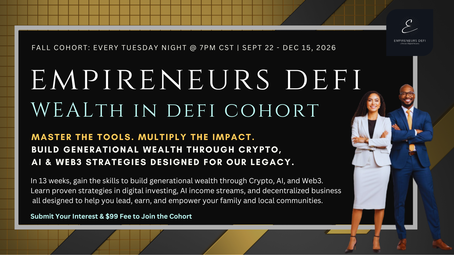 This 13-week intensive cohort equips you with the knowledge and tools to build generational wealth through Crypto, AI, and Web3. Learn essential strategies to grow and protect your digital assets, explore AI-powered income streams, and discover the future of decentralized business. Whether you're reskilling for the new economy or expanding your portfolio, this is your opportunity to lead, earn, and empower in the realm of excellence.